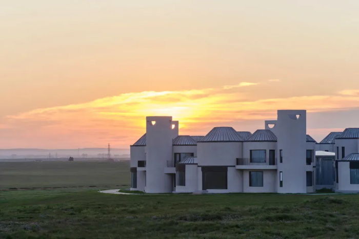 建筑师从蒙古包形象中提取圆柱+圆台形建筑体量,加以变形,成为独特的、大小不一的建筑单元,由此聚合而成为一个独特的院落。整体聚落由7个基本居住单元组成,每个单元的面积约305平方米。单个居住单元内包含了完整的客厅、厨房、起居室、茶室、4个卧室和一个瞭望塔。合理计算的人居尺度计算每个圆形空间的尺寸,同时通过相连接的通道形成有趣的室内空间氛围。在靠近草原的空间,落地玻璃窗提供了大面积的草原景观视野。