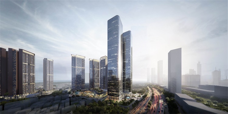 由于地块主要临街面较短,基于日照、自然通风、用户景观、城市天际线等多方面考量,设计将集合办公及酒店功能的双子塔面向滨海林荫大道设置,作为项目主体形象;三栋公寓塔楼设于南侧,可远眺红树林生态公园;并以商业裙楼连接南北,让商业价值最大化。