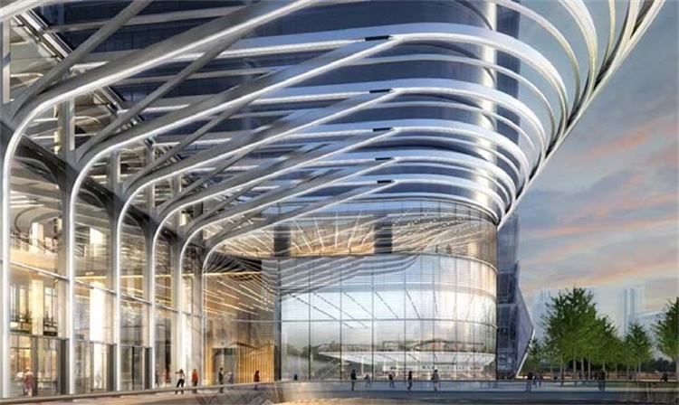 除此之外,设计在办公双子塔的底层的公共人流重要集散地打造了一个共享城市会客厅,以“流水”为设计灵感的主雨蓬,通过对结构系统的深入研究,以如同雕塑艺术的外观,吸引人流汇聚于此。