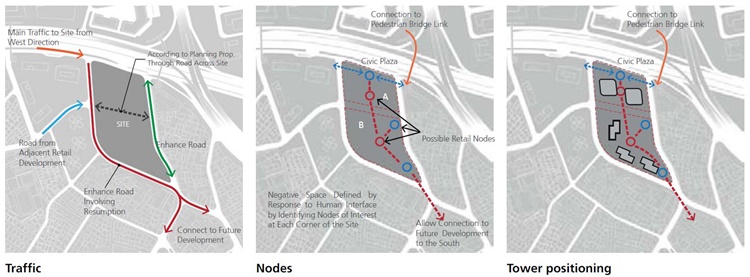 设计充分考虑到地块整体动线和交通连接,在主界面沿线设有多处下沉广场,将地下商业与地上各功能紧密结合在一起。并在双子塔北侧预留出城市前广场的位置,以此有效整合与地铁下沙站、京基滨河时代、车公庙片区的连接,同时将下沉景观广场与市政变配电站有机结合。在项目地下设有贯穿南北的公共人行通道,进一步改善区域内交通。