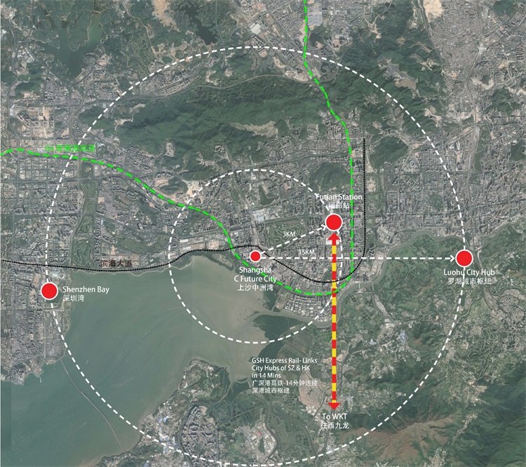 作为大湾区建设的重要组成部分,上沙村位于深圳福田区,南接香港,距离福田城际高铁站也只有不到十分钟车程;作为深圳CBD的后花园,它距离深圳金融街福田CBD、不到2.5公里,周边公交地铁一应俱全;自然风光优美,景观资源丰厚,北面可以远眺高尔夫球场,南部与红树林自然保护区隔街相望,地块周边还有丰富的文化旅游资源。