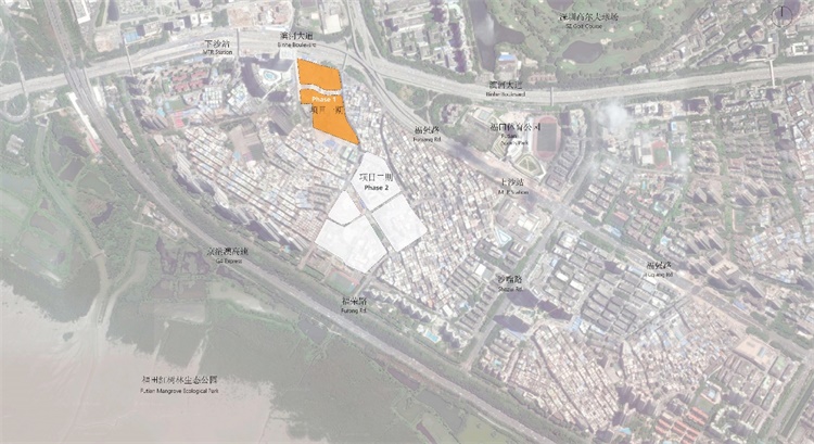 项目由三个毗邻地块相连构成,北部地块为一期,南部两个毗邻地块为二期,位于福田中心区西南侧上沙村的中心地带,有着优越的地理条件和重要的经济、文化意义。