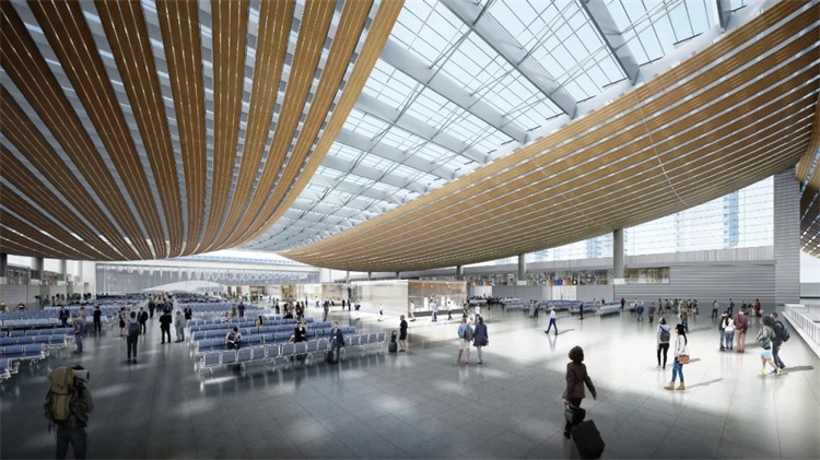 高大开敞的候车大厅内,柔美的室内顶棚线条顺应屋面趋势起伏错动。层层屋面间形成天窗增强室内采光及通风,与人性化的细节设计,共同营造出了舒适独特的候车空间体验。