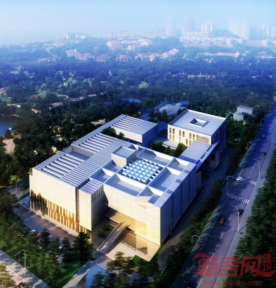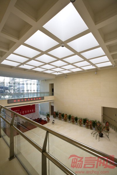 设计充分考虑场地因素对美术馆布局的影响,尽量削弱美术馆庞大体量对周围环境的压力,使公园与建筑互相融合、互相渗透,努力形成“场中有馆,馆中有园”的优美意境,充分体现建筑与园林的互动关系。在整体布局上借鉴传统园林巧于因借、旷奥相济、小中见大、欲扬先抑、明暗相衬、塑造意境等手法,以序列型的陈列馆及三个带中庭的方型实体围绕一个中心庭院来营造空间氛围,同时用曲折有致的通道回廊将各建筑相连。设计充分考虑场地中保留树木的因素,巧于因借,形成以古树为背景的中心庭院和树院。在美术馆建筑这一空间载体的考虑中,并不追求建筑的形式感对视觉的冲击,建筑立面以平缓的直线、简洁的体块来表现地域建筑的刚直与硬朗,外观采用灰白的主调色彩与葱翠的环境融合,以其方正、内敛的气质体现建筑的端庄。外立面以灰白石料为主,以石材自然厚重的质感较好的表现出建筑的抽象性,增强建筑的体积感和雕塑感。
