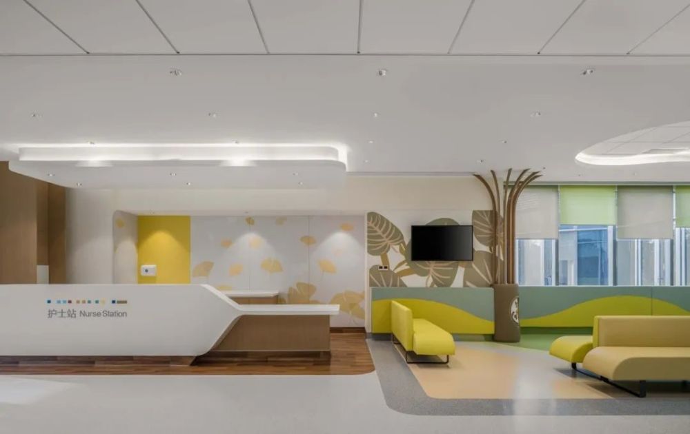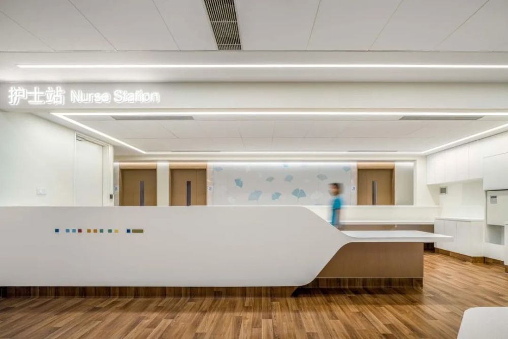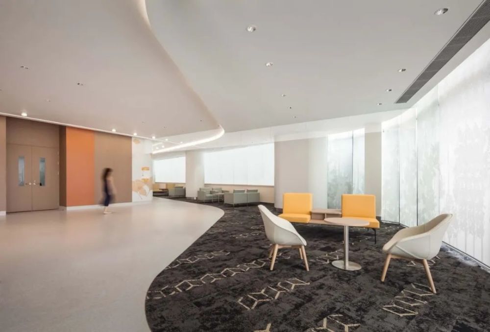大堂内定制的暖色调布艺以及银杏叶图案的墙面,烘托出亲切温馨的氛围感。嘉兴作为著名的旅游胜地,吸引着众人在秋日里来此观赏金色的银杏叶。银杏树象征着力量、希望和韧性,这些特质也被设计师提炼为抽象的设计语言,运用在医院室内设计中。