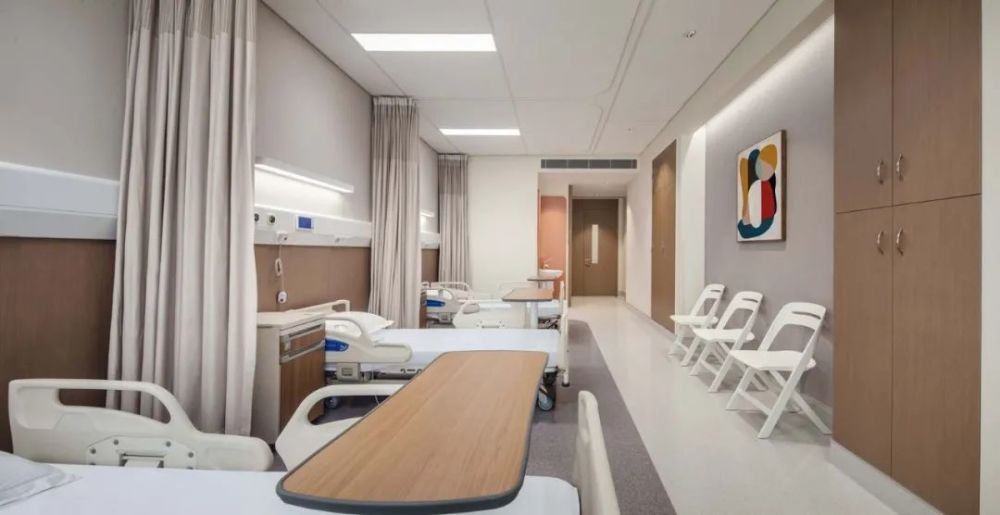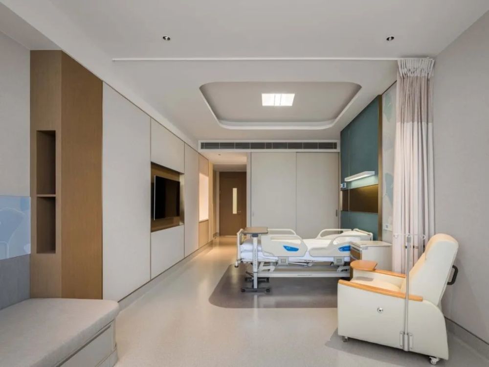 医院的设计优先考虑了患者的体验感,树立与病魔对抗的积极形象。例如,半数的整合医疗单元(IPU)都朝南,保证最大程度的自然采光。同时,加宽的走廊、优化的外部视野、温度与照明调控、疗愈的配色等细节,都在尽可能提升患者的舒适感。设计还照顾到了家属在护理过程中的需求,在病房中摆放了舒适的访客用座椅,并拓宽了住院床位周边的空间以及家属等候区的面积。