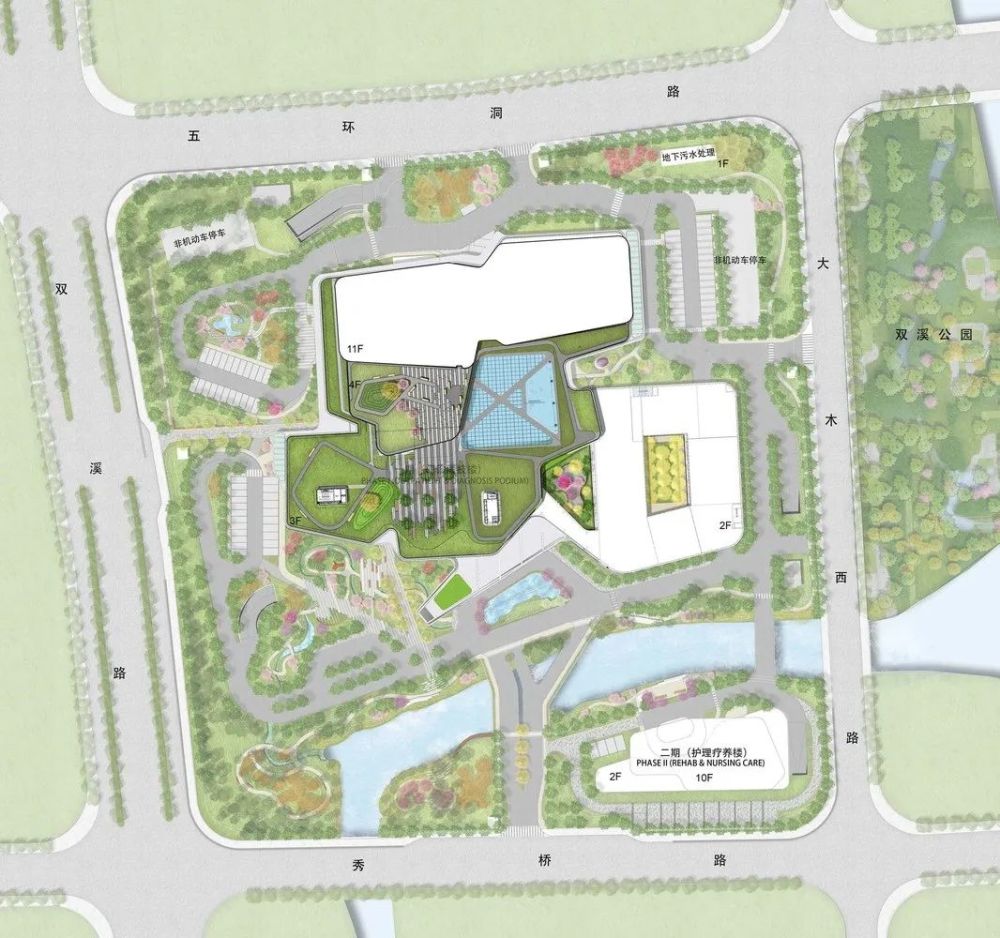 医院位于公园般的环境之中,和交通主干道保持一定距离。植被与树木也很好地隔离了医院与周围的噪声。此外,建筑的朝向也考虑了盛行风向与自然采光,降低对人工照明的依赖,并在可能情况下提供自然通风。