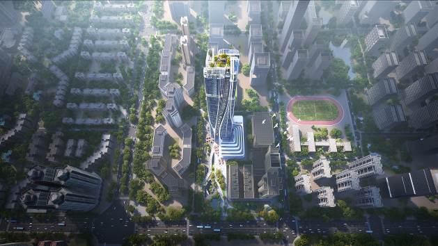 M0产业用地性质的超高层综合体,为各种不同复杂业态的融合和空间营造带来全新的课题和挑战。项目包含创新产业用房,自持办公、居住、及商业等多种业态。设计充分考虑到周边建筑日照需求及建筑各业态的视野景观,将裙房设置于临近公园的东侧,塔楼则置于靠近路口的西侧,其中商业功能置于低区,将与东侧的城市公园联为一体。产业用房及办公置于中区,提供高效的城市连通效率,连接都市车水马龙;公寓置于高区,东西南北朝向均可欣赏城市美景,并为城市产业及使用者提供非凡的工作及生活体验。
