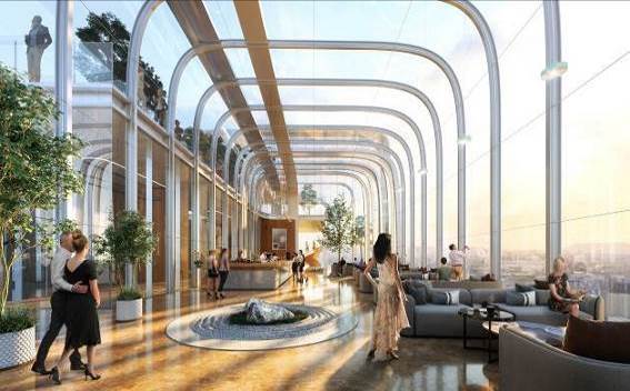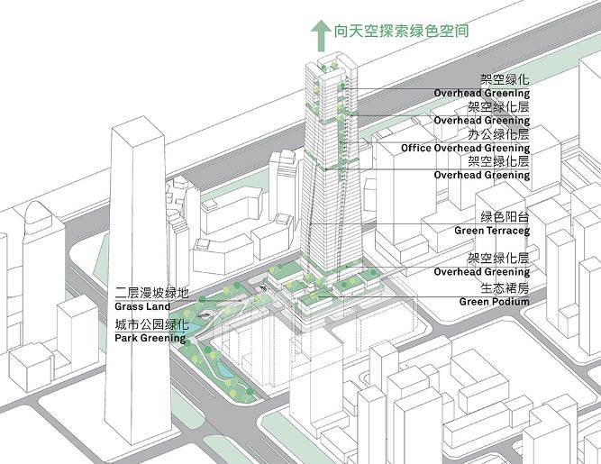 设计在有限的场地内打造出一系列垂直绿色公共空间,绵延而上,建筑本身和东侧的城市花园形成一个共同体,并且使低层及地下商业与地铁也形成有机的紧密联系。从层次分明的绿地景观、入口水景,到商业裙房多层级的绿化平台和屋顶绿化空间,以及设置在避难层的空中花园、垂直庭院与屋顶花园,丰富的自然景观打破了建筑的物理界限,并通过公共步道将景观立体联通,与城市绿轴相互映衬。多元的绿色生态空间,搭配空中大堂、云端会所等系列功能,为使用者营造舒适宜人的空间体验。