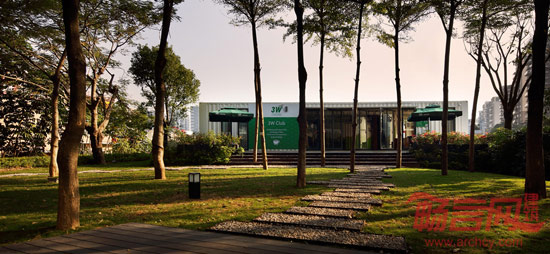 移开土方后,在首层主体建筑后侧形成了一处进深6米左右的灰空间,根据高度我们设置了三排可以坐人的大台阶并合围成了一处可以进行观影、演说、沙龙等活动的半室外空间。同时打通和改造了基地右侧原有相邻的向上楼梯,使其打开的更为宽阔,同建筑更为结合、呼应。从南广场入口望去,白色的两组集装箱纵横交错,形态上呈现出安静的气质。在二层树林中穿行,葱葱树影和霞光中隐现出建筑另一种斑斓多彩的情调。