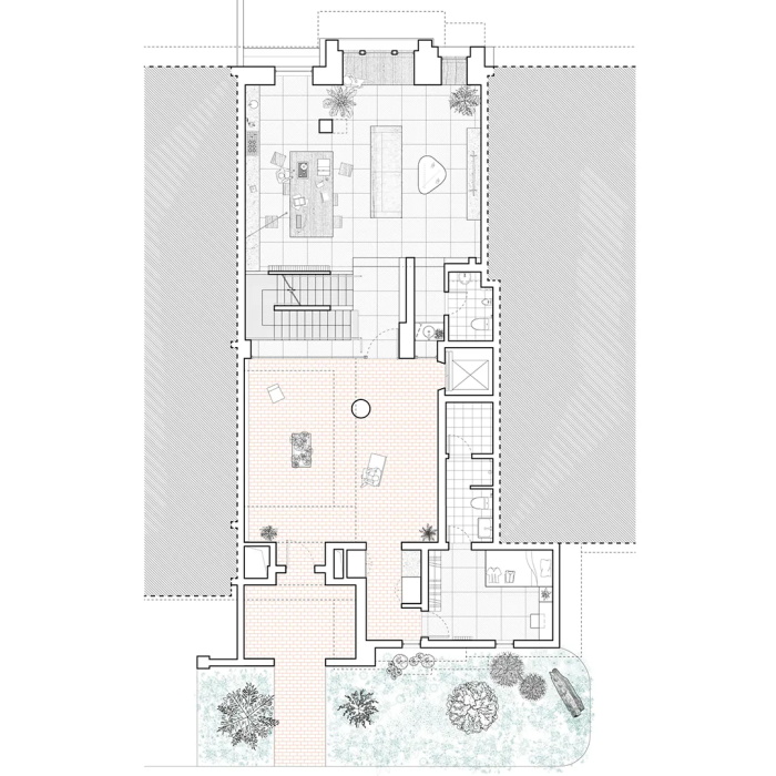 在二层,通过挪移一堵面向天井的墙体,设计解决了增加无障碍电梯、改变客房位置,扩大天井面积半户外部分使用潜力、增加了换鞋更衣间等目标。在一层,通过取消一排墙体,北向的娱乐室与晾晒门廊被并入室内,餐厅被前移至靠近后院,第一次让室外景观成为就餐活动的一部分。