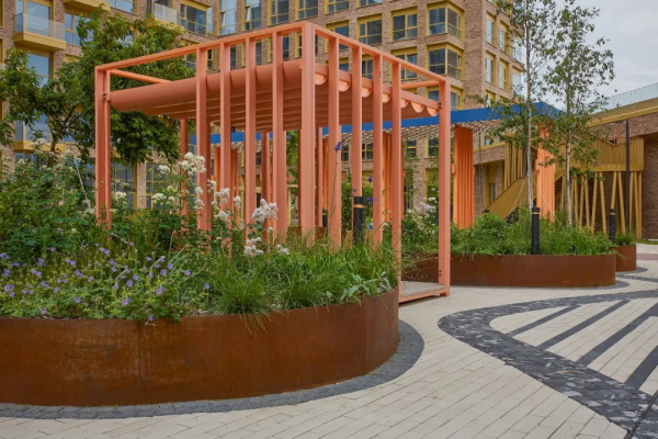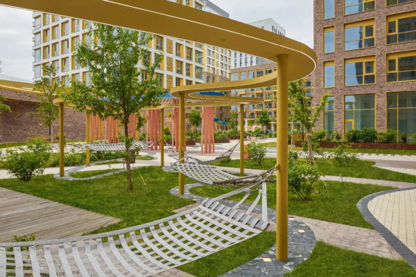 WOW住宅综合体的庭院被构想为一处沉浸式的景观空间组合体,在这里,规划几何、艺术意向与日常功能交织在一起,形成统一而连贯的空间叙事。项目名称体现了设计者希望唤起情感共鸣的初衷——一种建筑意义上的“WOW”体验,类似于 20 世纪抽象艺术所具有的表现力语言。