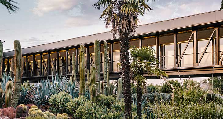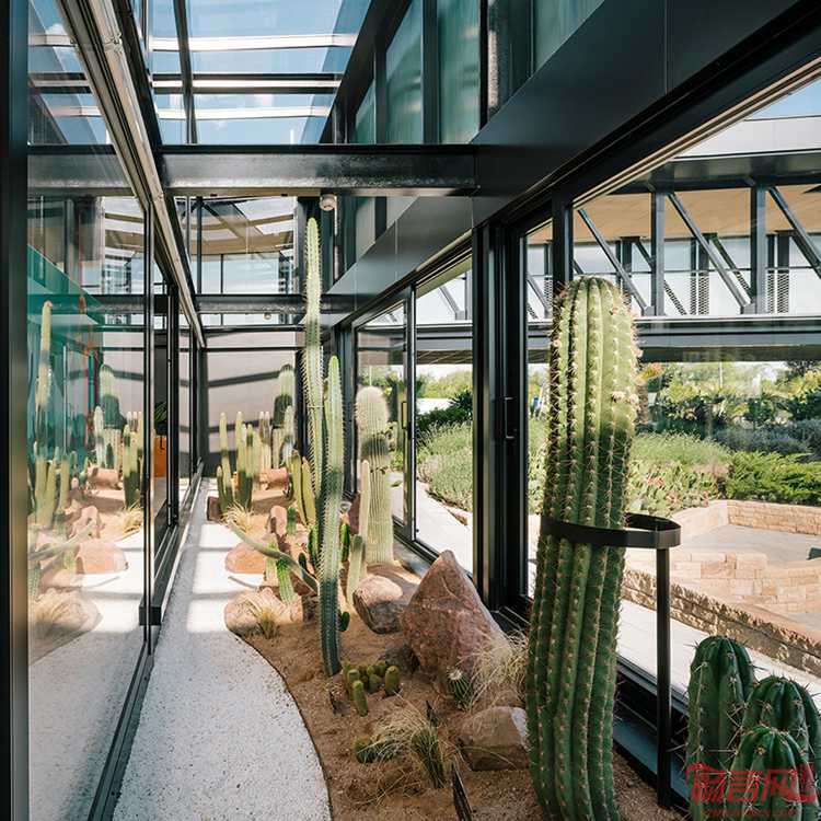 Garciagerman工作室完成了西班牙马德里北部小镇上的沙漠城市项目。这座仙人掌中心拥有宽敞的植物园,内有种类多样的旱生植物。通过张力绳索悬吊的室内温室为植物提供生长空间。这里不仅每日对外开放,甚至还提供导游服务。设计师认为这是一座公告牌建筑,一座高架的横向结构,同道路平行,内部空间序列围绕回廊建造。沙漠城市温室上方舍偶屋面顶棚,这里还有展厅和销售场所,餐厅,商店,办公区。