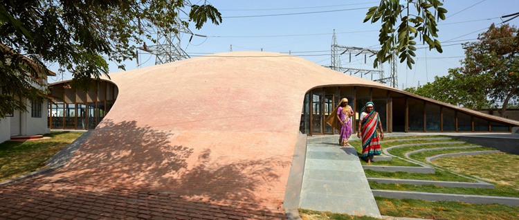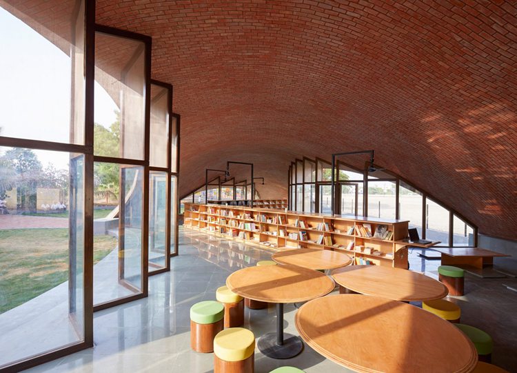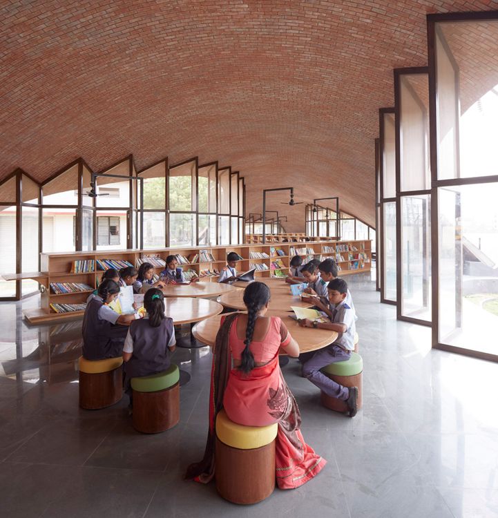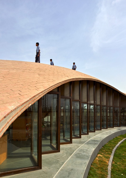 项目位于印度Kopargaon,由Sameep Padora & Associates事务所设计。原建筑拥有穹顶砖砌天花,扩建项目是儿童图书馆扩建,设有弧形屋面。设在孟买的事务所设计了Maya Somaiya图书馆,业主是Shri Sharda英国学校,位于Maharashtra邦城郊。建筑占据了现有学校和校界之间的长条地块,可远眺附近的农田。场地条件决定了该建筑线性的平面方案,流畅的屋面如同从地面生长出来,围合了建筑。