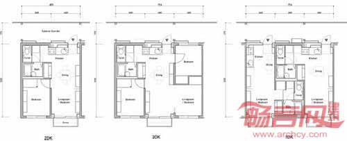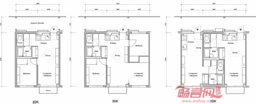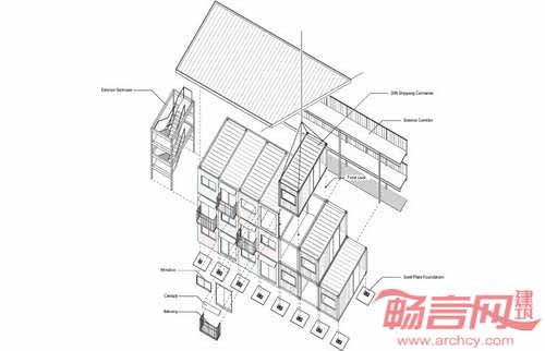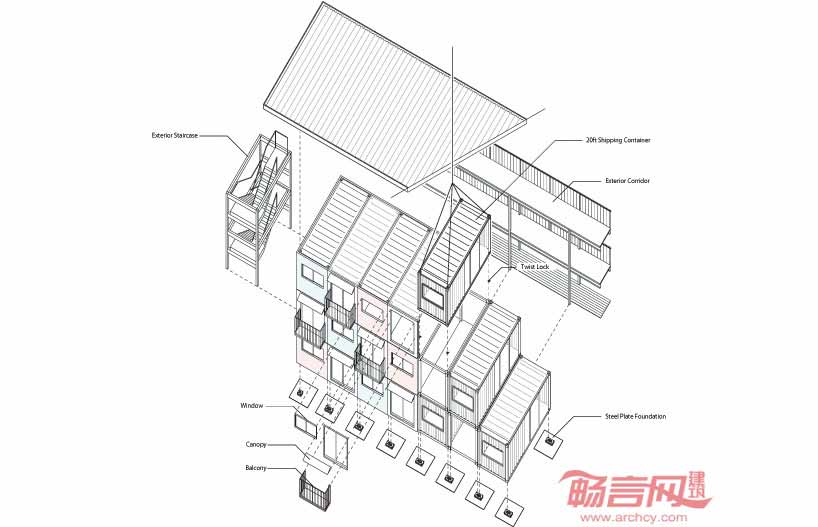 为了解决场地实际的困难,建筑设计公司选取了一个巧妙的方案——将20尺集装箱叠成三层棋盘样式。方案给予了宽敞和开阔的居住空间,并提供了政府并未考虑的储存空间。由于许多区域具有类似的景观特征,建筑可以在其他受灾地区复制,因其良好的抗震功能,可以用作长期住宅。建筑提供了三种户型,分别是用于1到2人居住的19.8平米住房,适合3到4人居住的29.7平米住房,以及适合4人以上的39.6平米住房。