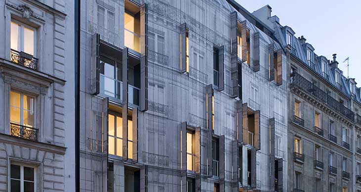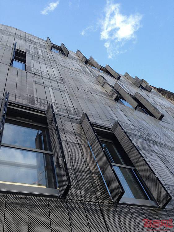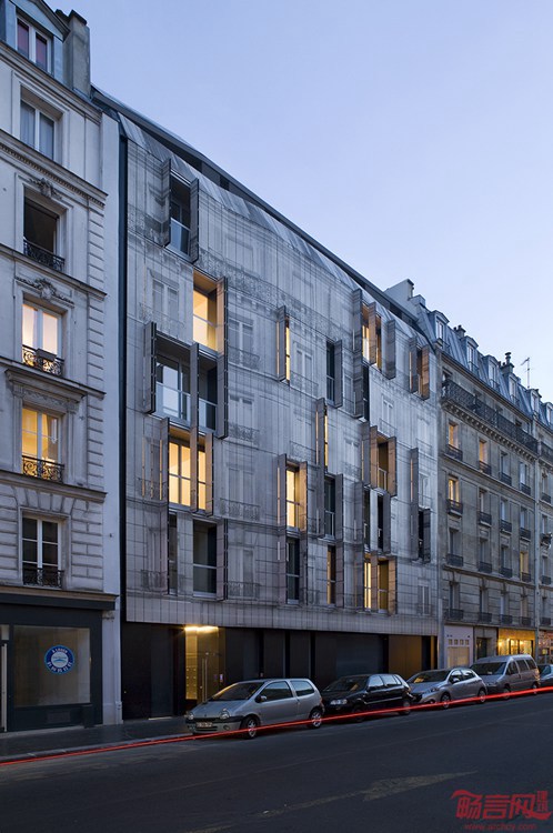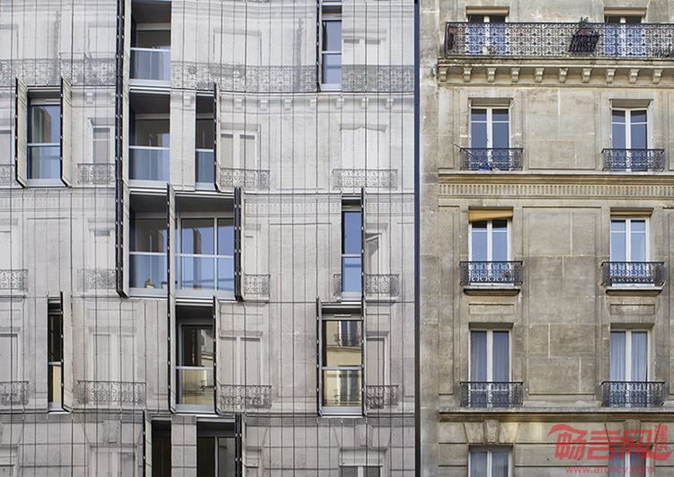 Chartcorb工作室完成了这座巴黎Rue Championnet公寓的改造。设计师为其添加了风格优雅的奥斯曼装饰外立面。所在的区域大部分建筑均建于奥斯曼时期(1853-1870),其外墙几乎是同样的,而设计师也是为了使其风格与周边建筑相符。因此,设计师在大块的阳极氧化铝板上印制了外立面,并覆盖在建筑外墙上,使其恢复巴黎建筑特有的风格。