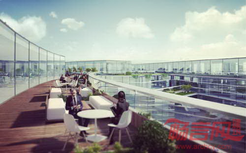 园区建筑一层商业活动蔓延到广场和景观之中。建筑上层办公区域连同户外绿色平台,繁茂的绿色植物增添了生气,使得炎热的春夏季节变得凉爽宜人。建筑使用的遮阳百叶结构对太阳辐射起到了防护作用。