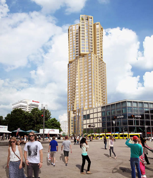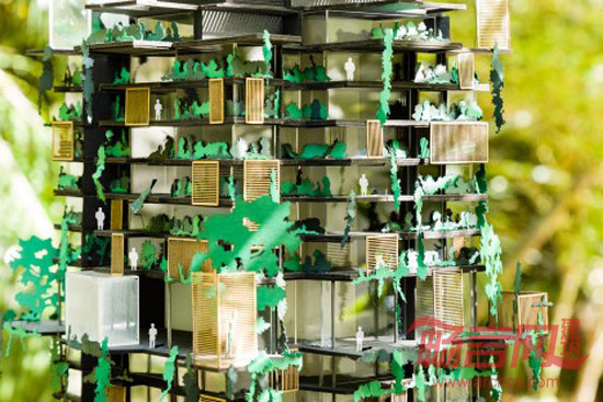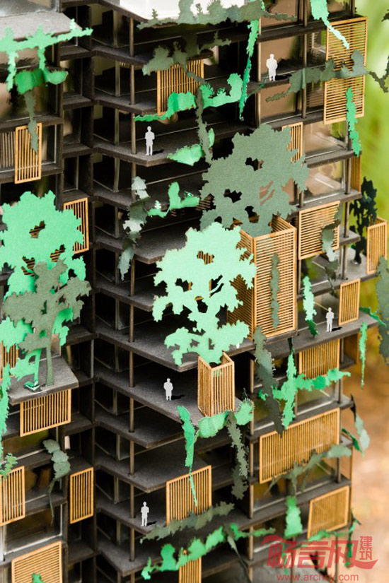 大楼设计高度为150米,根据设计模型来看,大楼阳台上布满了绿色植被,幕帘从阳台上伸出。