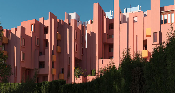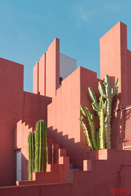 Andre Gallardo将位于西班牙的La Muralla Roja称作“摄影师的天堂”。这一项目由Ricardo Bofill于1973年完成,带有堡垒般的外立面,模仿周边峭壁的轮廓,成为阿拉伯地中海风格建筑的代表。这一项目带有夸张的色彩,强烈的几何图形和极具特色的当地植物。