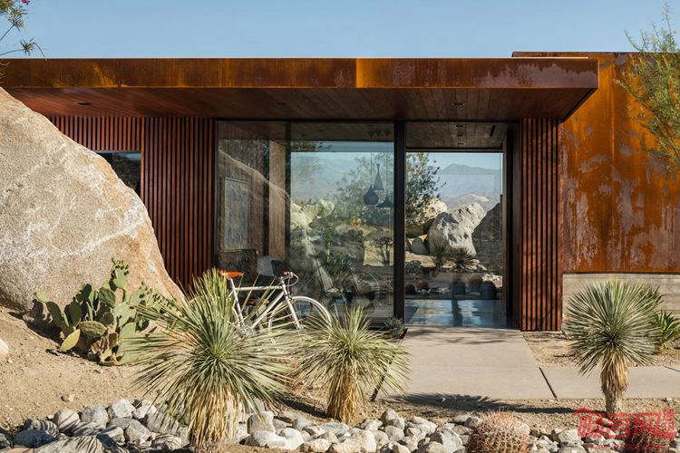 洛杉矶AR+D工作室设计了位于加州棕榈泉的一座覆盖了耐候钢的门卫室,其悬挑结构构成了屋面,遮蔽了下方的停车场和巨石。沙漠栅栏门卫室是这一正在施工中的住宅区的安全检查点。场地享有面向Chino峡谷的广阔视野,其铁锈色外立面同周边的沙漠环境融为一体。项目面积85平米,最大特征是包含突出10米的悬挑。