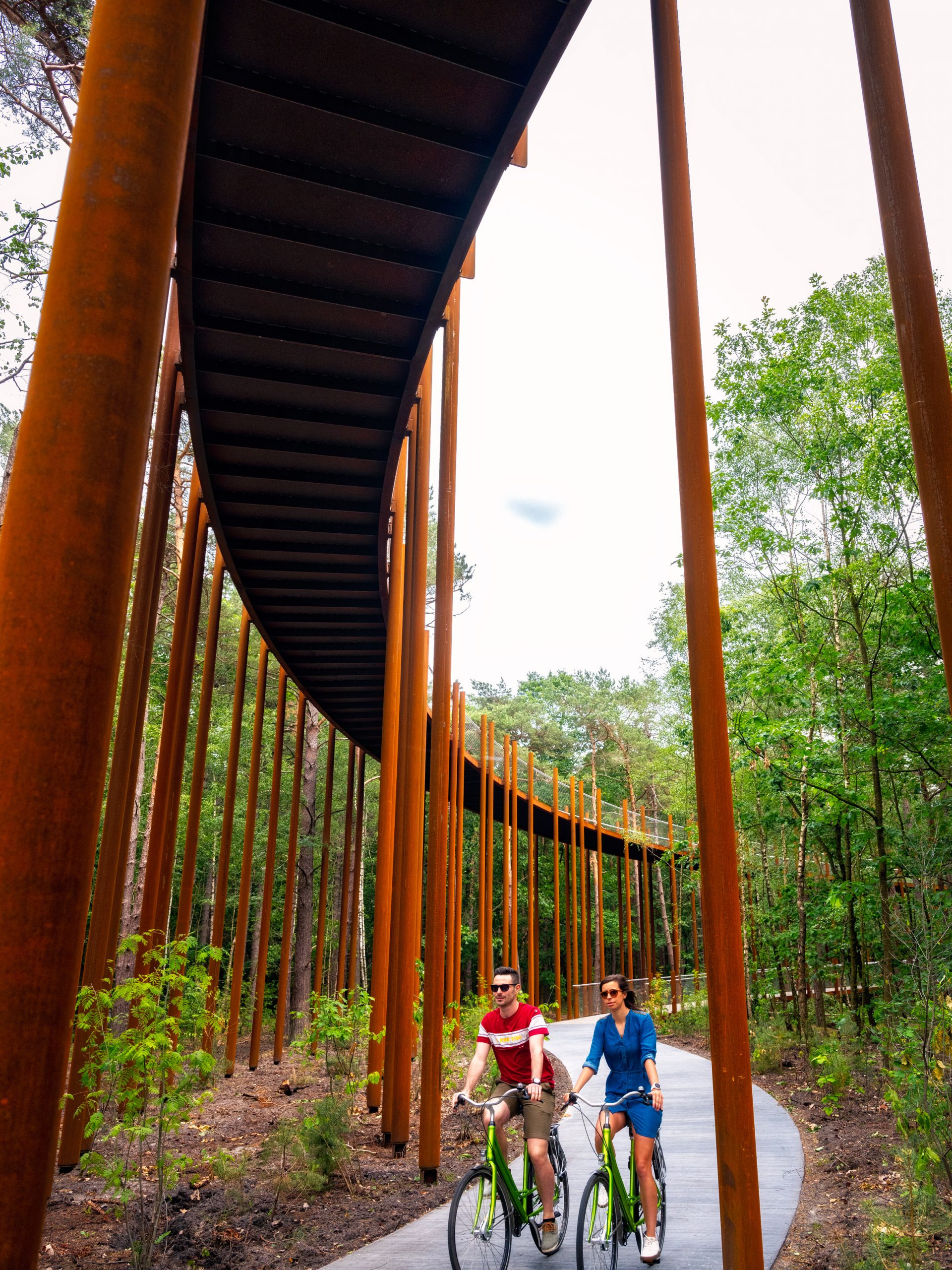 比利时Buro Landschap工作室和De Gregorio & Partners公司合作,在比利时林堡创建了一条穿越树林的自行车环形赛道,成为自行车运动网络的一部分。该项目可以让自行车使用者穿过树林,在高出地面10米的高架道路上,看上去像在树梢间骑行。