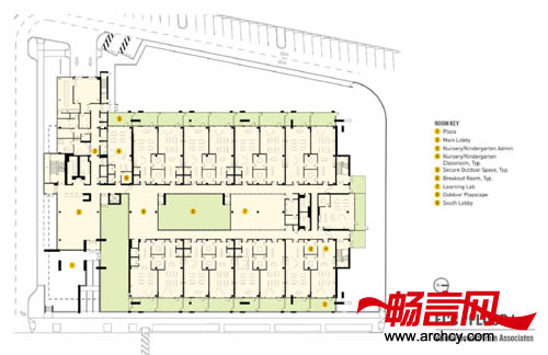 大楼的一大创新就是,它将户外区域和学习实验室、教室联系在一起,这样,学生就可以在学习环境和户外活动区域之间自由流动。大楼的一层是托儿所和幼儿园教室,每间教室都可以方便到达适合该年龄段儿童的活动区域、公共庭院和位于楼中心的学习实验室。二楼是一二年级的教室和绿色屋顶,那里不仅有人造草坪,还有天然植物。