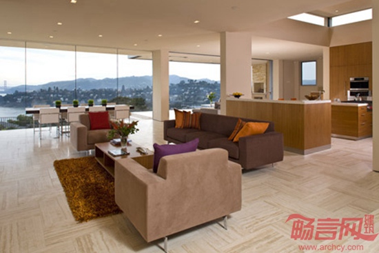 Swatt Miers工作室为美国旧金山湾的一座1970年代住宅实施了翻新改造。住宅设有无框玻璃门,提供瞭望金门大桥的绝佳视野。Garay住宅具有金色色调,占据了Tiburon地区的山顶位置,距离旧金山市区半小时车程,享有270度观景视野。