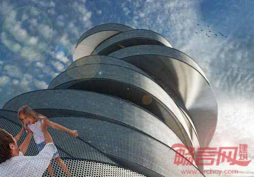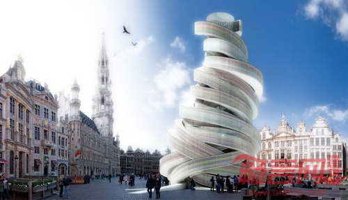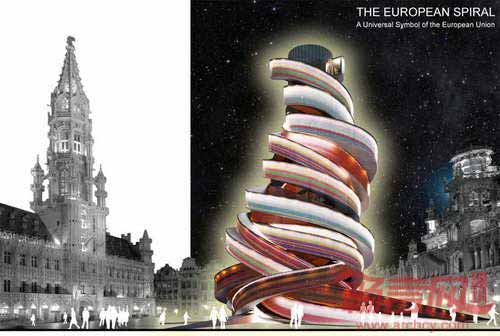 Madeoffice公司公布了“欧洲螺旋”视觉效果,该设计旨在创造向欧盟致敬的纪念性建筑。项目地点位于欧洲“首都”——比利时布鲁塞尔。设计强调团结一致、共同发展的主题,展现出各国国旗扭曲环绕、最终成为一体的形象。项目方案构成不同寻常的色彩“旋风”,使平面、截面和立面呈现出螺旋造型。夜间,多孔结构各个方向安装了若干灯管,提升了标志性建筑的色彩装饰效果和整体外形。