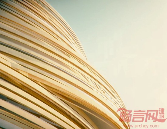 建筑整体结构由木质屏板所‘缠绕’,形成动感迷人的外立面效果。