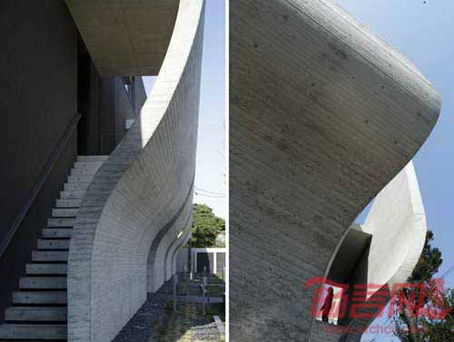日本Artechnic事务所完成了东京Setagaya的一处名为“微风”的房屋设计,设计主旨是在城市环境中创造出类似私人海滩度假所的建筑。建筑外形如同坚实的混凝土贝壳,花瓣形曲面结构几乎支撑了整个居住单元,向南面敞开,而将北面的视野和光线阻隔。