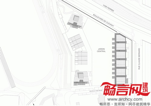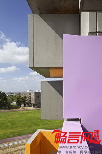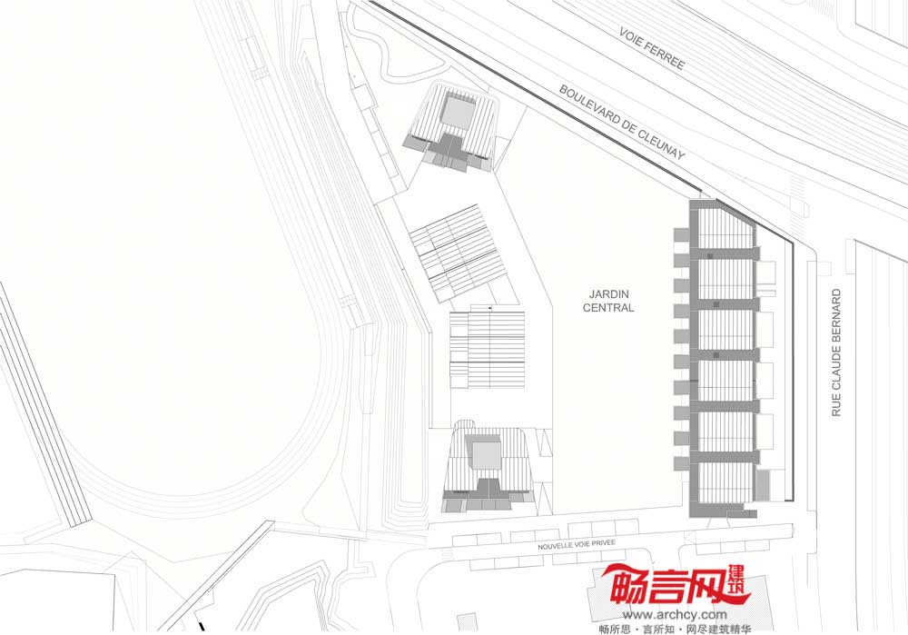 每栋楼的立面覆盖了一层混凝土或者一层罗纹金属装饰层,形成了灰色的统一外观。