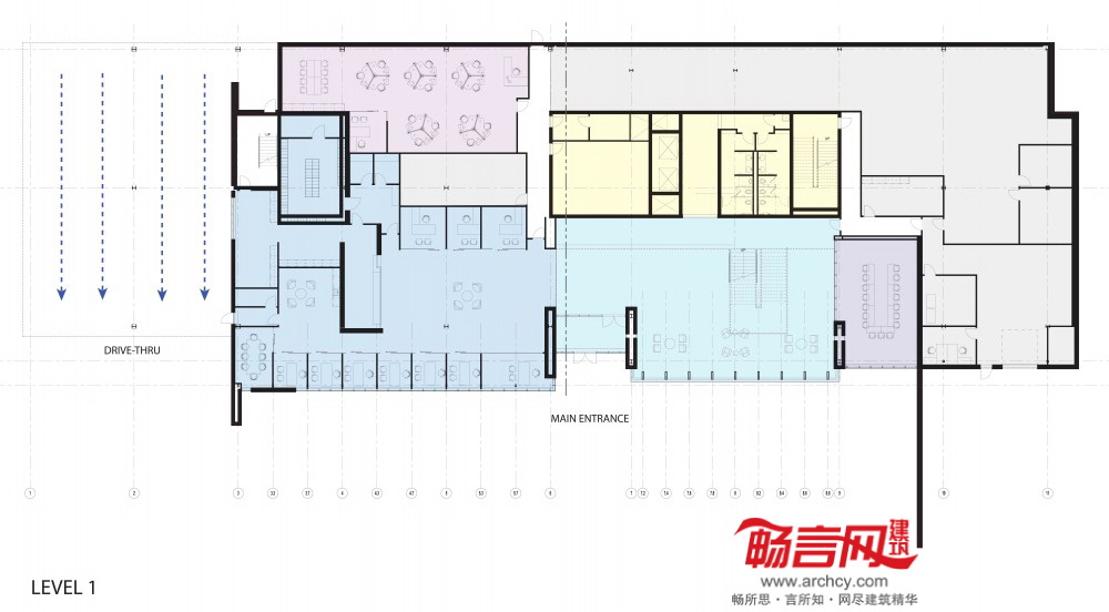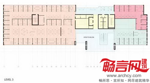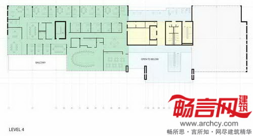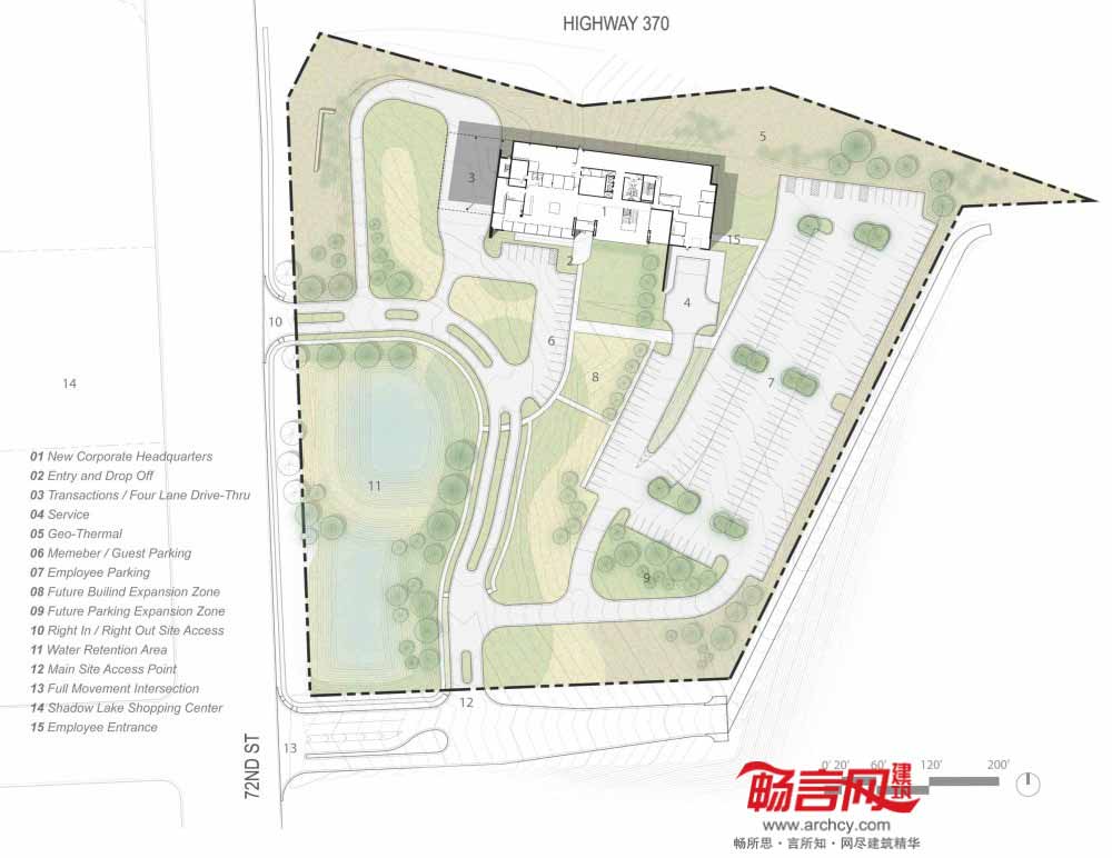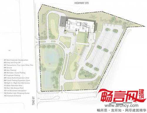 大楼正中将设立“交流中心”,四层的中庭带有的木质楼梯通往公司所有部门,以鼓励不同部门、会员和员工间的沟通交流。建筑的二至四层使用了玻璃和铝金属板,一侧伸出了30英尺,从而为车行道提供了遮蓬。