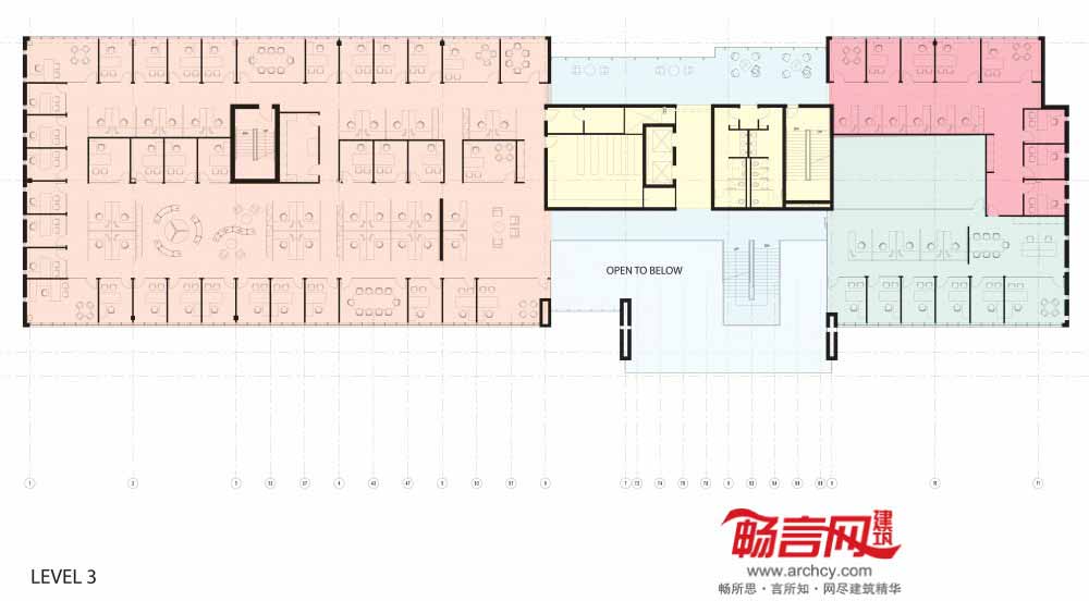 楼顶露台和绿色空间为员工提供了全角度观景机会。北立面的走廊提供了带有巨大窗户的办公空间,利于创新协作及灵活的团队合作。