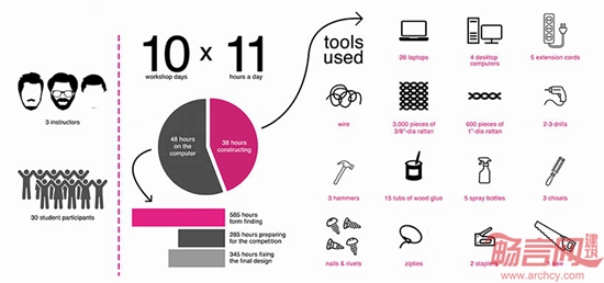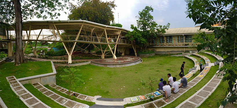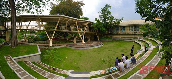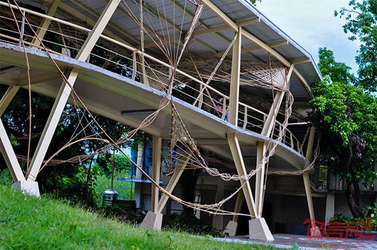 绿色几何实验室(GGlab)完成了菲律宾Rattan悬链线场馆设计。菲律宾Diliman大学师生参与了该项目。项目坐落于一座桥梁之上,连接两座校园建筑。项目采用参数化设计,显示了科技工具方法的潜能。项目实现了数字工具和传统低技编制工艺的结合。项目仅耗时两周即告完成。