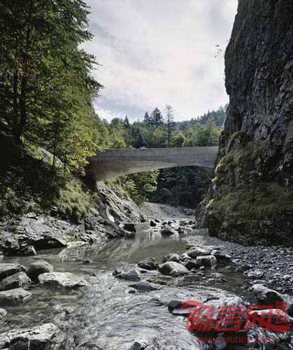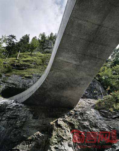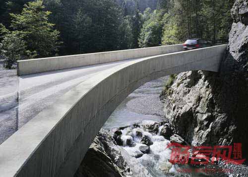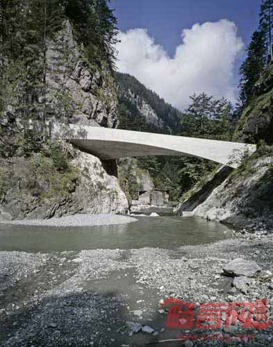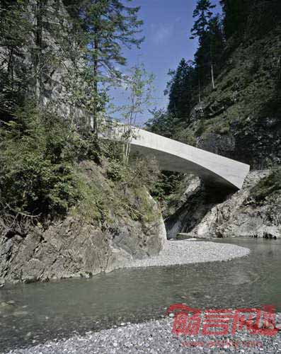 Marte.Marte设计工作室设计的一座混凝土桥梁跨越了奥地利西部一条风景如画的河流。桥梁连接的道路一段是Dornbirn市,另一端是南侧的村镇Ebnit。桥梁设计参考了当地传统建造手法,营造出具有和缓弧度的坚实混凝土体量,并在桥梁中央顺道路角度做出一个转角。