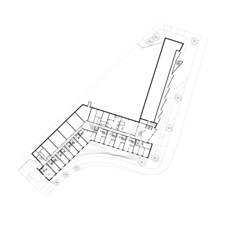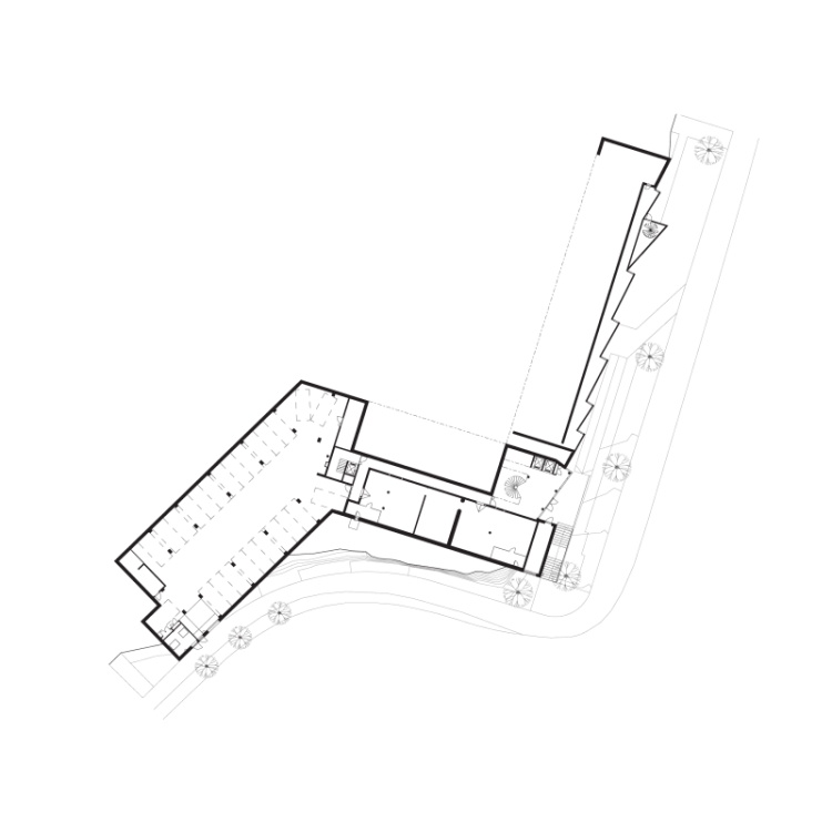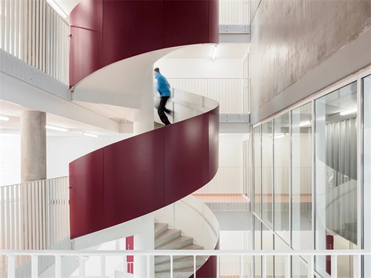 由于场地地势陡峭,临街的入口设在地下层,庭院入口设在二层。大部分公共空间设在一层,因此两个入口都能看到公共空间,因而鼓励学生社交并参与公共活动。公共区也同中空/螺旋楼梯相连,使不同楼层和入口相互连接。