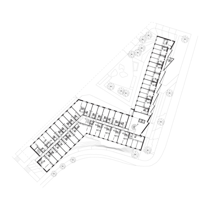 由于交通噪音的干扰,建筑选择只对庭院敞开。褶皱外立保护室内区域不被太阳光照影响,变得过热,同时也疏散了交通噪音,减少了对另一侧低层住宅区的影响。南立面进行了闭合和空白处理,北立面则相对开放和友好。