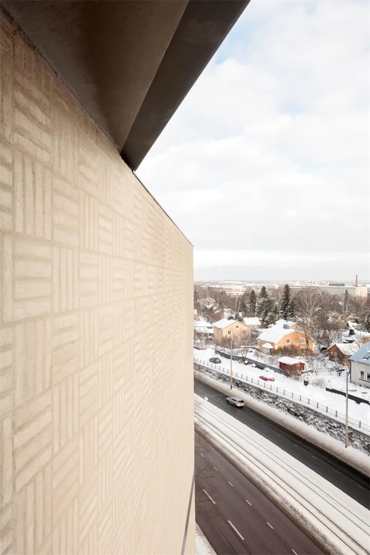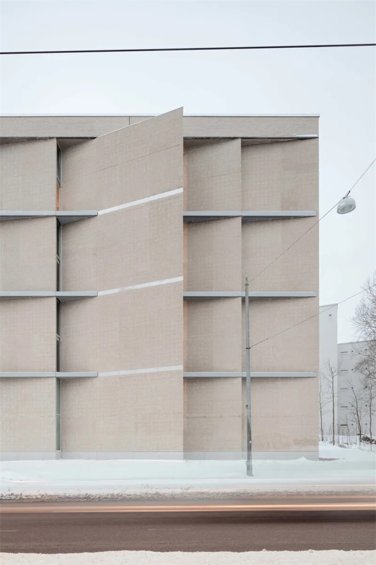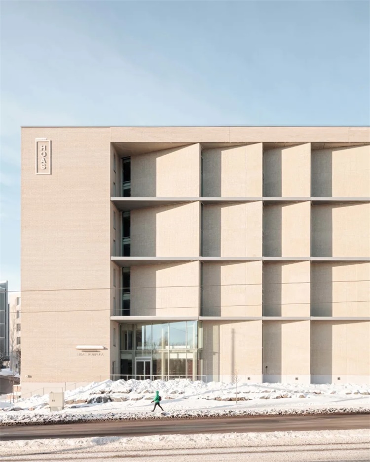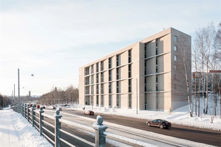 这是赫尔辛基大学Kumpula校区扩建项目。项目由PLAYA ARCHITECTS建筑事务所设计,包含公共空间和200间学生宿舍。场地狭小,位于繁忙的交通道路和教学楼之间的坡地上。