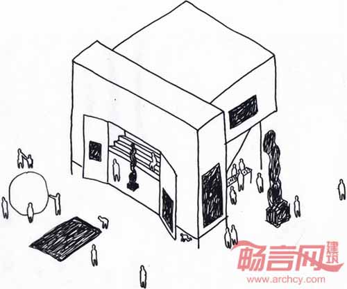 举办露天演讲活动时,大批观众可以聚集在场馆周围;而在举行小型活动时,可以在立面上安装隔板,从而将室内空间与环境间隔开。