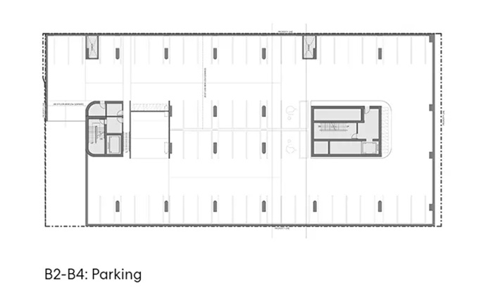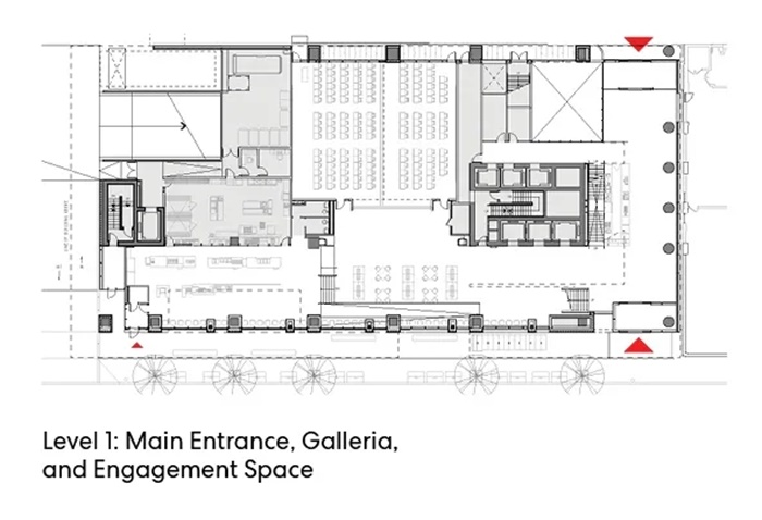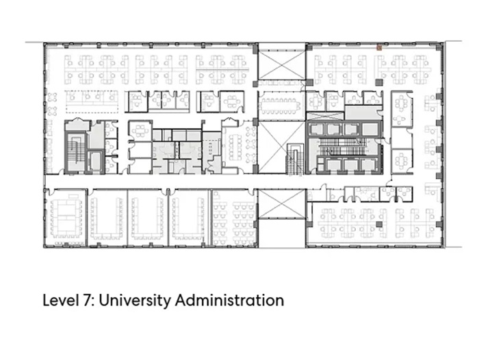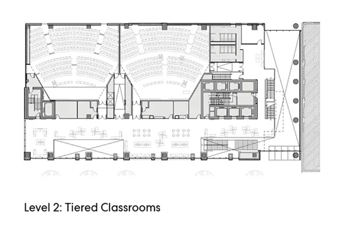 用充满活力的橙色覆盖层描述的连续的公共空间线,将这些不同的项目相互连接,并连接到远处的城市。公共功能、零售和大型教室位于建筑的前两层,在提供每小时周转所需的通道和挤压空间的同时,使街道充满活力。一条贯穿街区的室内街道在校园内创造了一条新的行人路线。