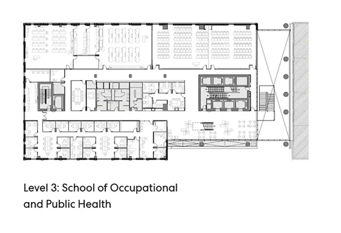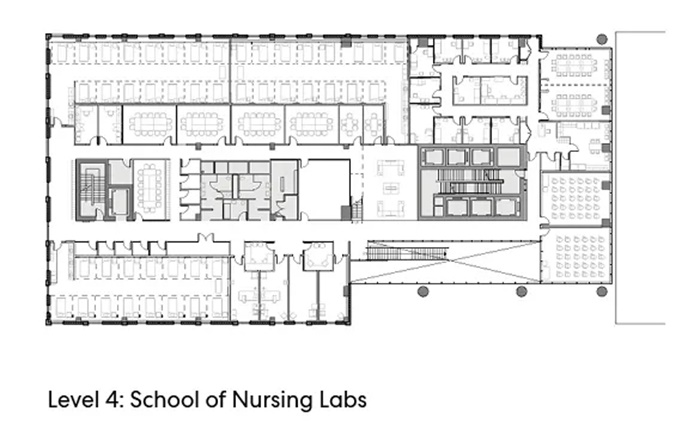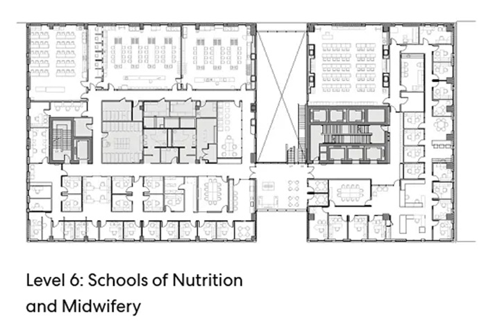 按照计划,四个学院——护理学院、助产学院、营养学院、职业和公共卫生学院——共享技术丰富的教室、数字制造实验室、灵活的研究设施、大学管理和330张床位的住宅。