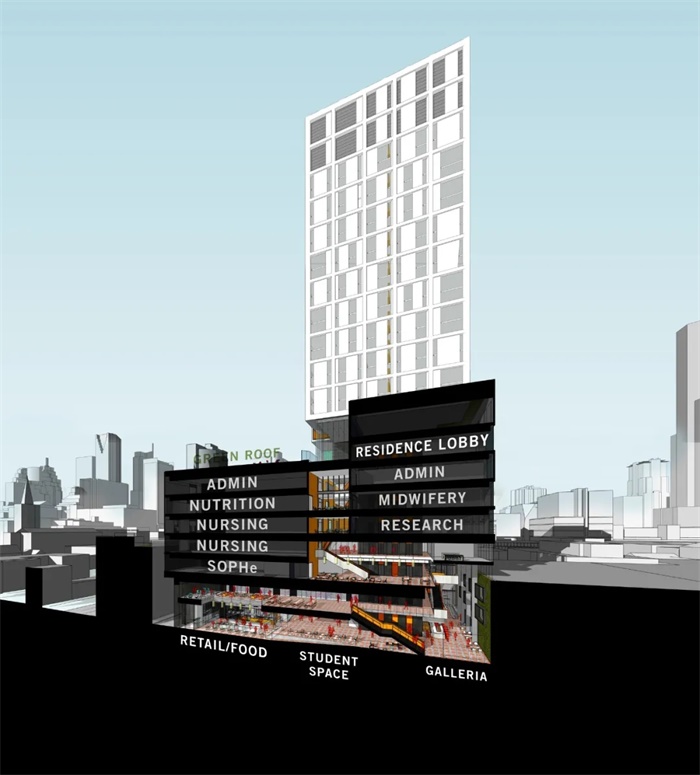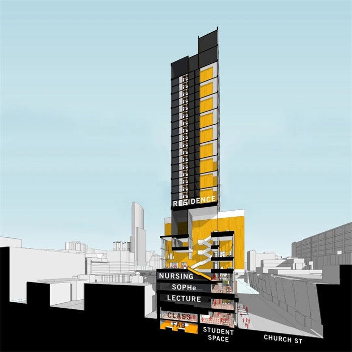 瑞尔森大学位于加拿大最繁忙的十字路口几步之遥,占据了多伦多最密集、发展最快的街区之一。在过去的十年里,大学的招生人数增加了近50%,随着各种创新的新课程和项目的引入,校园设施面临着巨大的压力。但与此同时,周边地块的爆炸性发展也制约了大学的扩张机会。