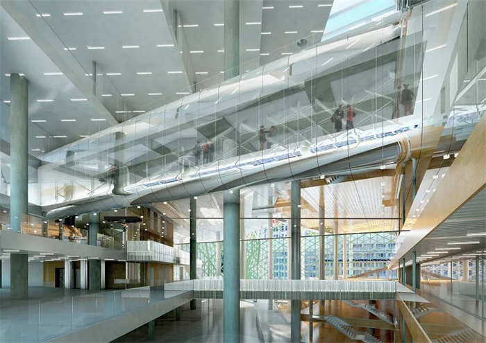 OMA设计打造的Axel Springer出版集团园区大楼位于柏林,建筑师通过一系列的台地式楼层设计,以营造一种独特的山谷感。而这一“山谷”空间也就成为了公司各类非正式空间的举办地,以更好地传播相关信息与知识。