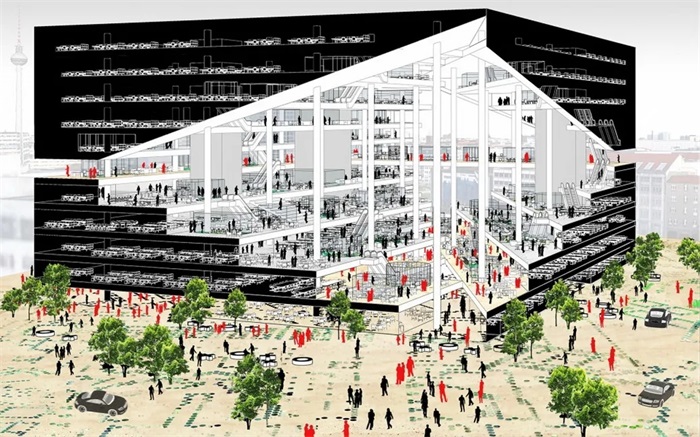 新大楼采用了对角线平分的中庭设计,其中庭沿着对角线将建筑一分为二,并通向Axel Springer总部。每层楼由有顶的正式办公空间和裸露在外的平台组成。建筑师将山谷沿着建筑一半处镜像,创造出立体的树冠空间。