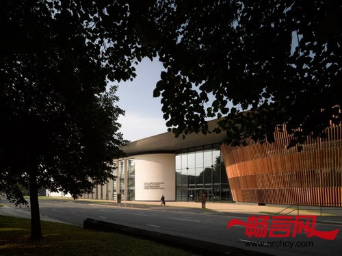 该建筑是由外向内设计的,每个表演区域都是单独的建筑。戏剧楼有一个新幕墙,排练大厅深入到了已建楼房附近的林中。这几座楼由一个简单的飘浮屋顶连接在一起。学院的新入口朝向美丽的Bute公园展开,骑楼是整个学院的脊梁,它不仅将学院的各个功能区域连接起来,也是设计和服装学院的展区,同时,它还是音乐学院的“肺”,因为它是公共区域的通风口。