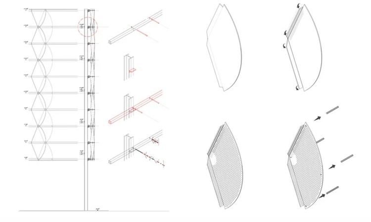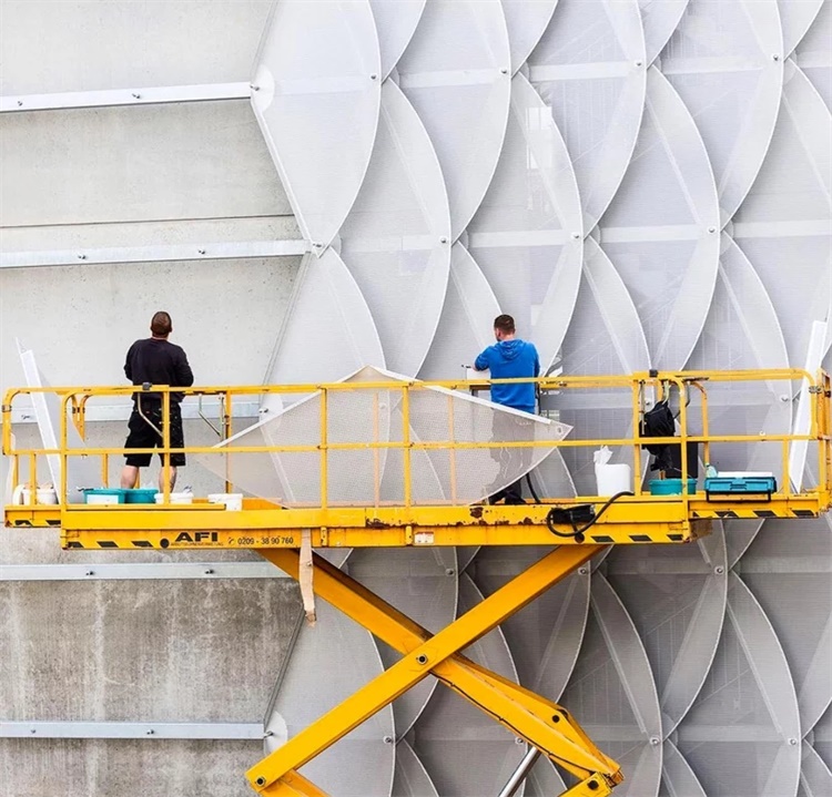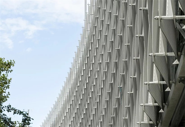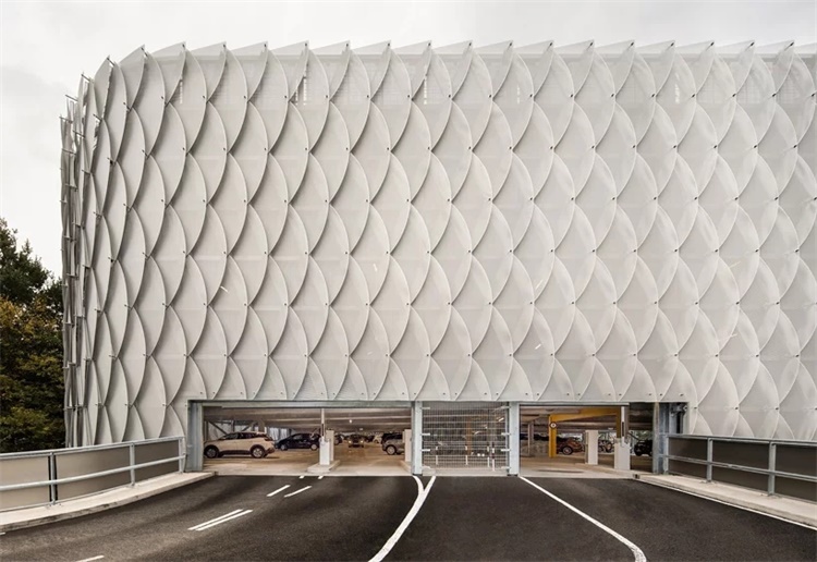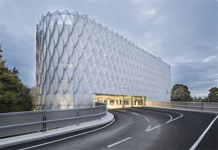 Wulf建筑事务所为德国科隆博览会中心设计了P22A停车场。项目坐落于Zoobruecke桥边,5层停车场提供3260个停车位。项目包含轻质通透的外壳,统一设计的外立面包裹了S型弧面结构,如同巨大的有机表面,给人呼吸感。Wulf建筑事务所受到博览会中心和科隆市政府的委托,营造了创新、具有象征意义的停车场外立面,采用3000块激光切割的金属板,诗意的表皮赋予建筑可塑性。金属板之间的缝隙如同“鱼鳃”,让空气在停车场中自然流通,并提供了充足的自然光线。