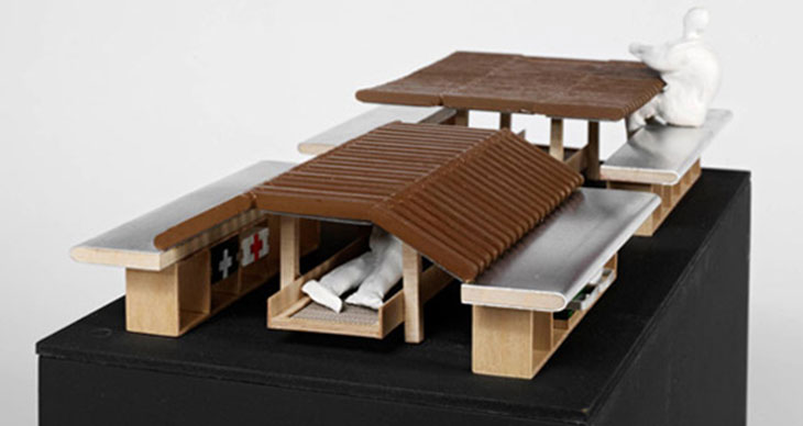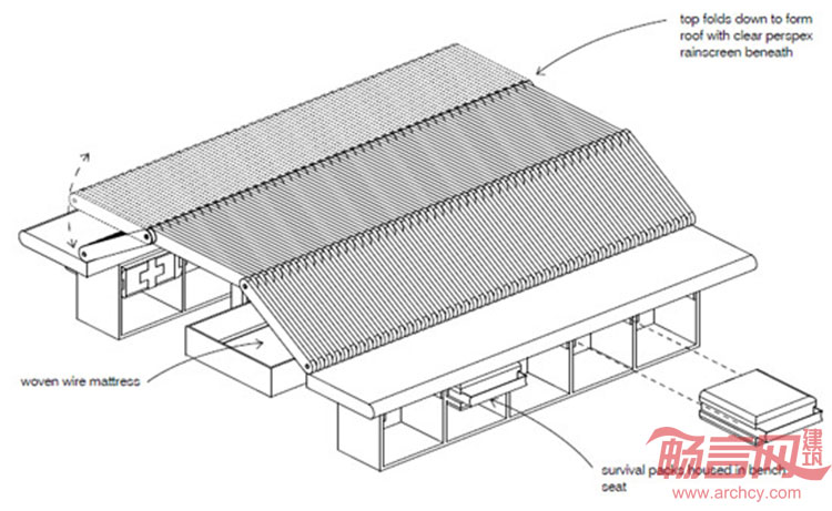 澳洲Sean Godsell建筑事务所成为伦敦V&A博物馆建筑师小空间展览的十九家设计公司之一。其方案名为野餐桌住宅,这个白天时间的餐桌在夜里会变成流浪汉的住所。餐桌可以放下,由下方的长椅支撑,成为屋面。不锈钢编织床垫和保护框由桌腿支撑。