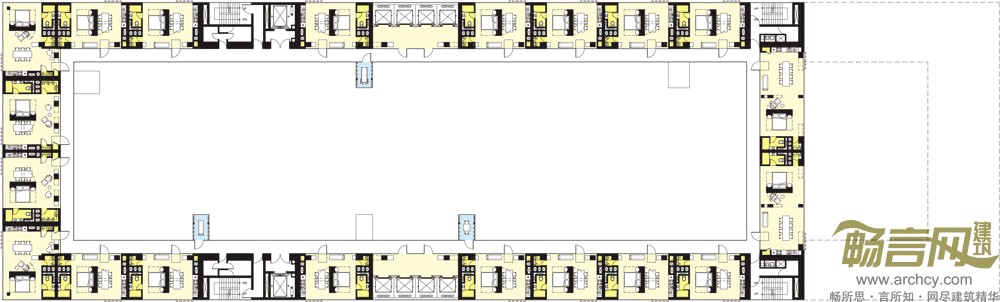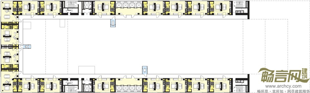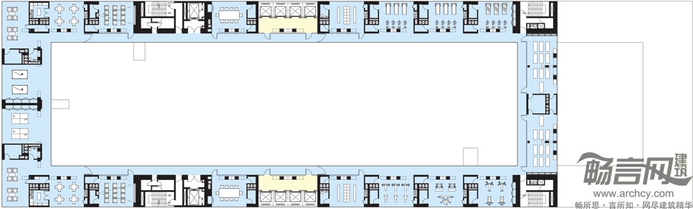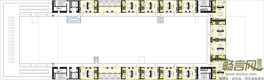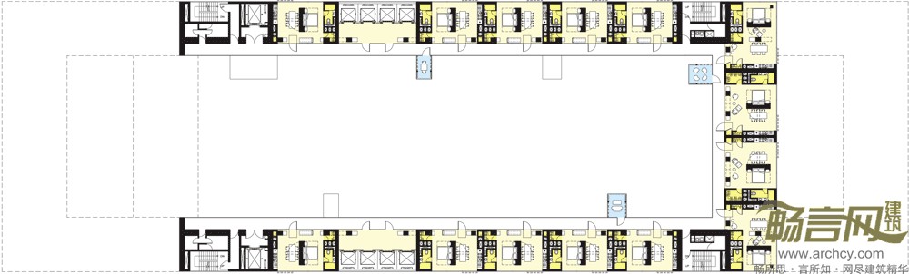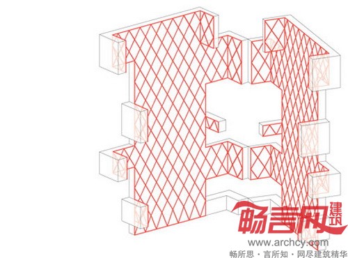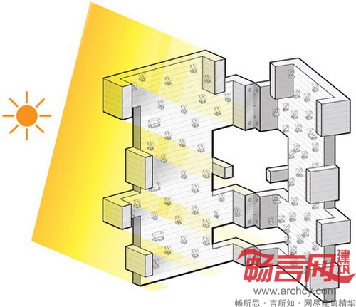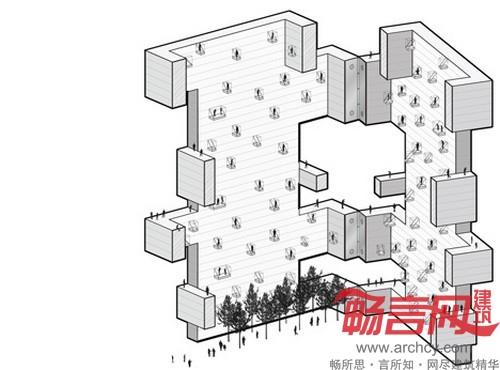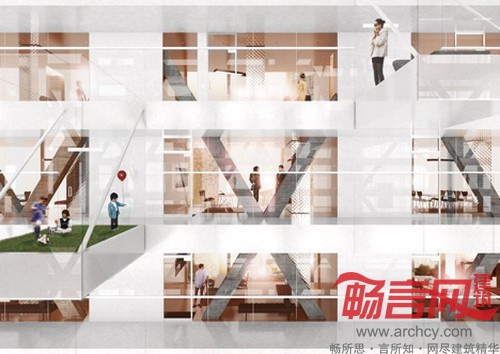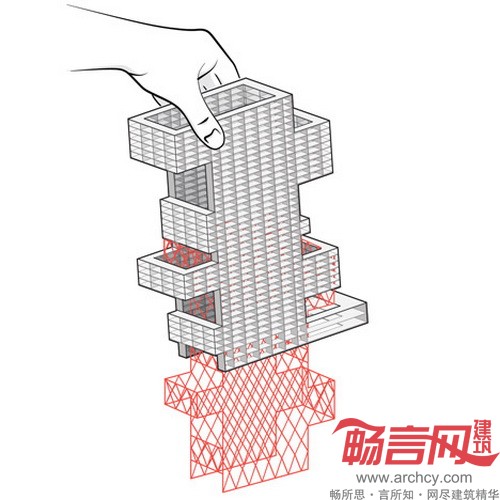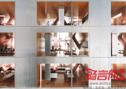 而设计师将R6楼体分为多个层段,每个层段之间沿着相反的方向“拉伸”出去,这样既保证了建筑大小不变,同时又很好的改善了采光和通风条件;而且,“拉伸”楼体还形成了很多天台,这样人们的公共活动区域就不仅限于楼底的中央庭院了。