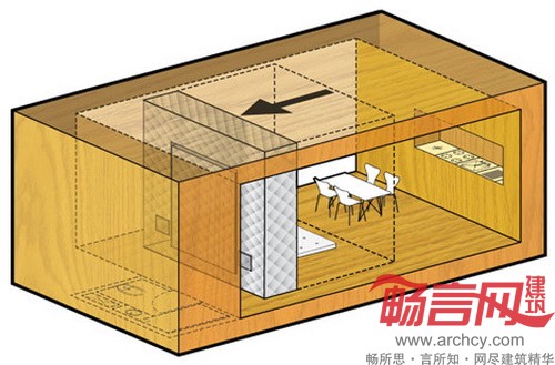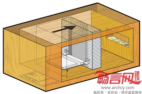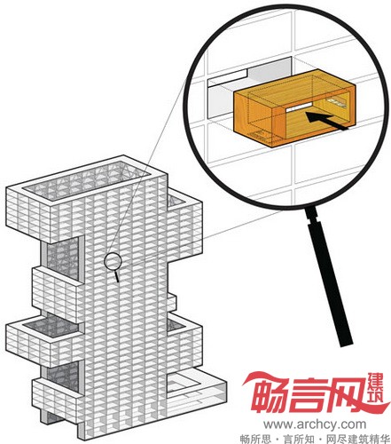整栋大楼就像一个巨型书架,而“书架”中的每个矩形方格就构成一间间单元房。房间里有一堵可以移动的墙壁,将卧室和起居室分隔开来;墙体中包含了折叠床、床头柜、沙发、电视柜、台灯和储物柜等等。