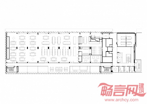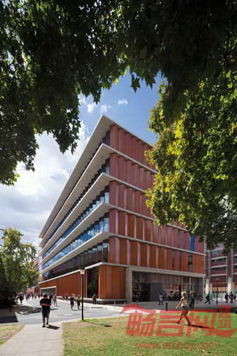 大楼入口占据了一个五层中庭,人员可以自由流动,一层设有咖啡厅和休闲聚集场所,从北侧道路和Maths草坪均可进入大楼。会议室和社交空间位于建筑四周,除实验室和办公空间外,中庭成为了研究人员、学者和学生沟通交流的场所。